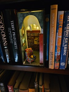 In 2016, I started making booknooks. They’ve improved over the years as I’ve picked up more tools, materials, and practice, and now I occasionally give them to charity auctions, which I announce on my website and Bluesky.